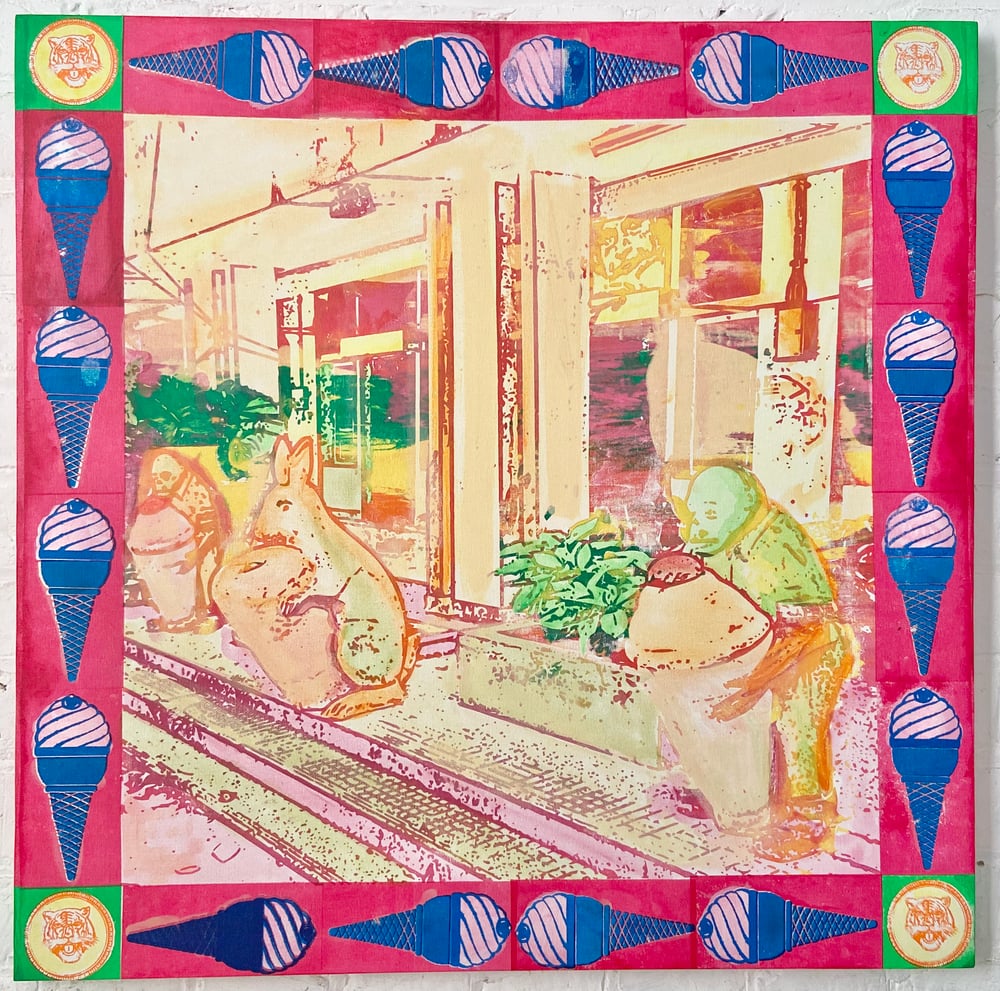 Collaborative silkscreen canvas by myself and Jordan Gray. Created from a photograph and images found on our adventures in India. This experimental artwork utilises many different colours blended together in a single pull of a squeegee. The print was then touched up with paint and framed with a tile of smaller prints, to create this psychedelic scene. This artwork is part of our Power Monkey Sound Horn exhibition.